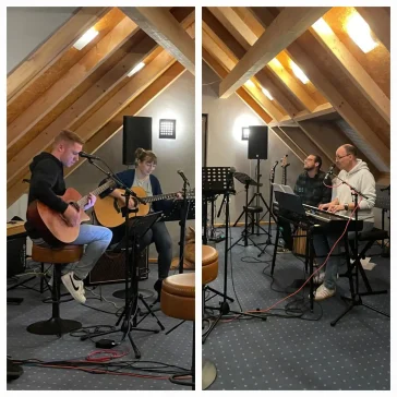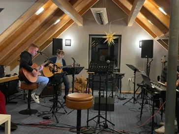 Alles ist dauerhaft aufgebaut, der Raum ist gemütlich, übersichtlich und sofort spielbereit – keine langen Aufbauzeiten mehr wie in manchem Gemeindehaus. So entsteht ein Ort, an dem sich Musikerinnen und Musiker voll auf das konzentrieren können, worum es wirklich geht: Musik, Gemeinschaft und Lob Gottes.